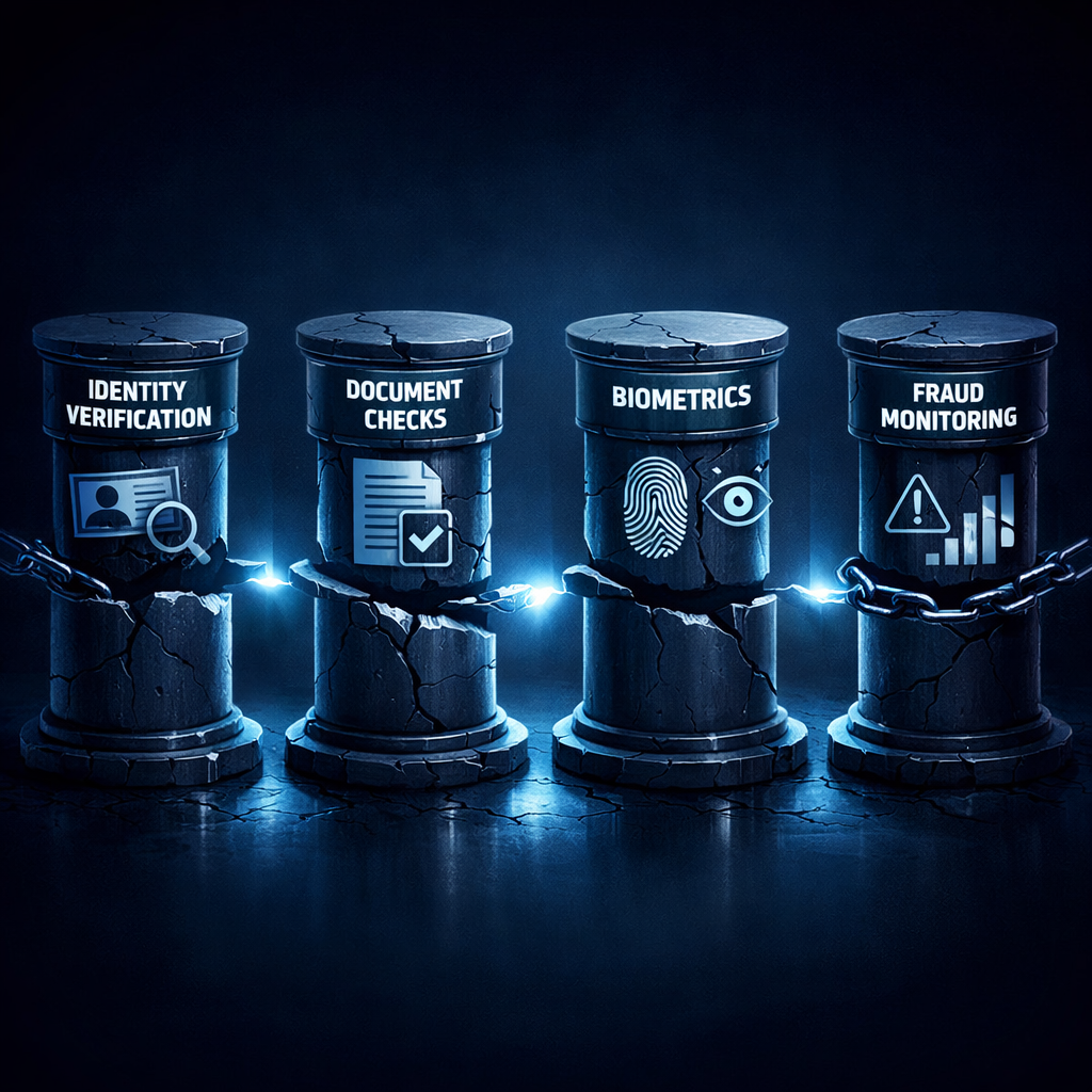 Document verification was a separate investment, often owned by a different team, answering a different question: are these documents authentic? Fraud monitoring asked a third question about transaction patterns. AML screening is connected to its own databases. Behavioural analytics sat somewhere adjacent to fraud, barely integrated with anything else.